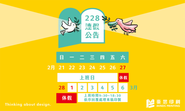 【連假公告】2/27(六)至3/1(一)麥思印刷全體放假 服務公告By mindscmyk2021 年 2 月 25 日我們 3/2(二) 見 — 【連假期間】 ❌暫停開版印製、客服、出貨 ⭕️網路服務皆正常收件 歡迎多加利用(*…