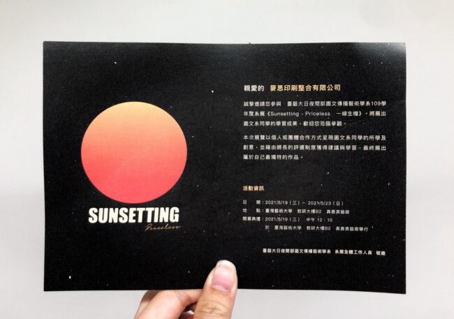 【Sunsetting – Priceless 一線生機】台藝大圖文系日夜間部聯合系展 服務公告By mindscmyk2021 年 4 月 17 日近日收到 #台灣藝術大學 #圖文傳播藝術學系 學生系展邀卡 前陣子我們與該校學生合作展覽 在5月份就能讓粉絲見…
