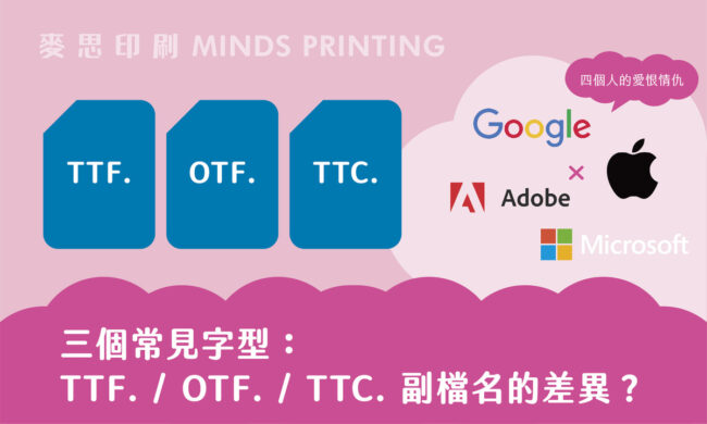 【三個常見字型】TTF. / OTF. / TTC. 副檔名的差異 主題知識文By mindscmyk2021 年 2 月 26 日TTF. / OTF. / TTC. 這三者差在哪? 都是字型檔,三個都好用吧? 字型檔案越大越好用嗎? Wi…