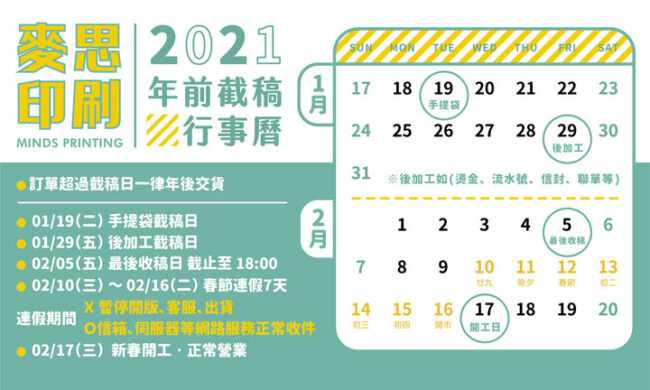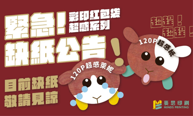 【緊急缺紙公告】彩印紅包袋超感系列 服務公告By mindscmyk2021 年 1 月 19 日彩印紅包袋 所使用紙材 120P 超感萊妮 / 超感紙 目前因超感鼠車車趕不及(X) 紙廠物料供應不及(O) …