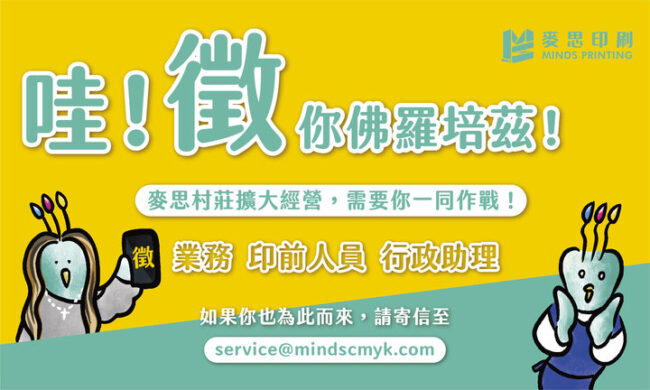 【徵才公告】哇!徵你佛羅培茲!徵你來麥思! 服務公告By mindscmyk2021 年 1 月 20 日→ 業務 → 印前人員 → 行政助理 感謝大家的支持與愛護?♀️ 近期因印務量增加,麥麥們一人當三人用;勢必…
