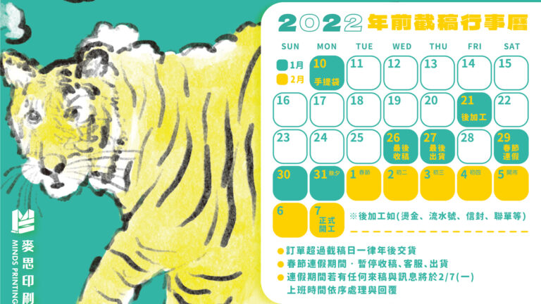 1 月172022 服務公告 2022年前截稿通知 服務公告2022 年 1 月 17 日 年節將至,麥思馬不停蹄趕件中💦💦 需要在年前拿到印刷品的朋友,請把握最後上傳截稿日, 以免要等到年後才能交貨唷&hell… Read more