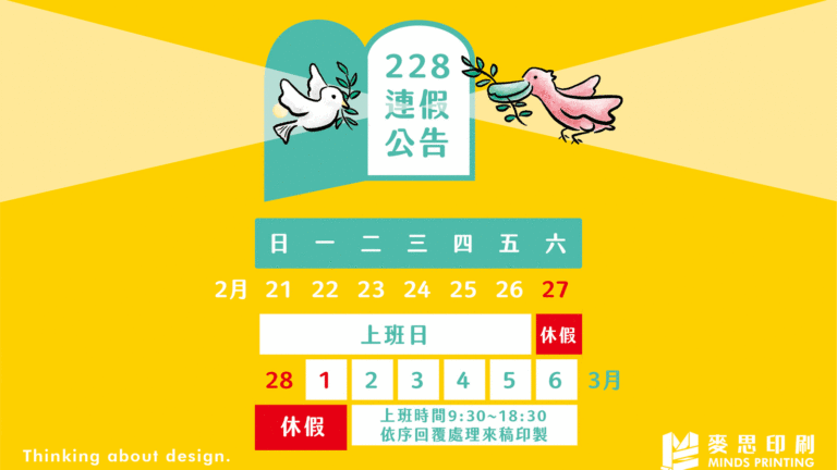 3 月302021 服務公告 【清明節】連假公告 服務公告2021 年 3 月 30 日 ? 4/2(五) 至 4/5(一) 麥思印刷全體放假 我們 4/6(二) 見? 【連假期間】 ❌&hell… Read more